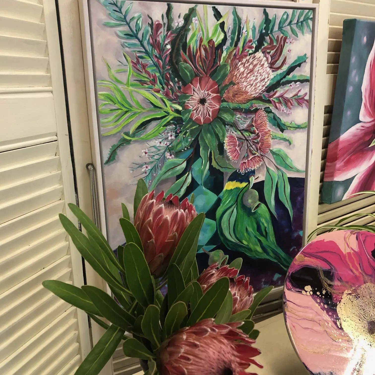 Painted with a friendly parrot hiding beneath the bouquet this painting has gone to its new home following a viewing at my last Open Studio event in 2023.